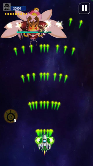 4、操控宇宙飞船消灭宇宙入侵者,飞船会自动开火,通过方向键可以移动飞船躲避怪物的子弹,也可以直接点击屏幕,飞船移动至点击的位置