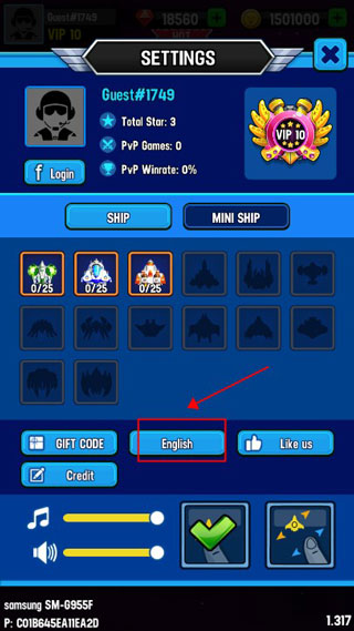 1、首次进入游戏后,先简单的过一下游戏的教程,然后回到主界面中点击左上方的“头像”,然后点击“English”如下图所示箭头指向位置处。