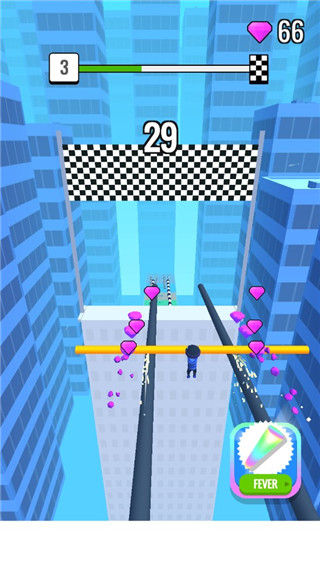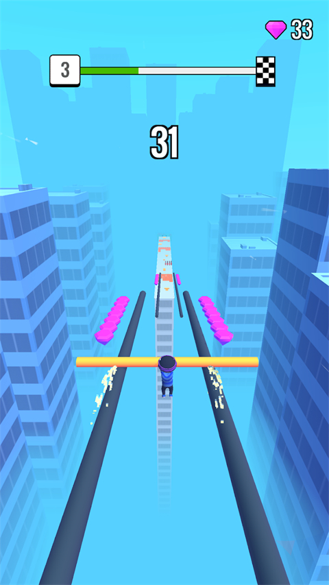 屋顶棍棍侠最新版(Roof Rails)是一款魔性动作跑酷游戏。游戏中,你将扮演一位可爱的火柴人,手持一根伸缩自如的长棍,在城市屋顶上展开一场惊险又有趣的跑酷冒险。屋顶棍棍侠玩法非常简单,通过左右滑动屏幕来控制角色,利用手中的长棍在轨道上滑行。你需要沿途收集木块来不断加长你的棍子,同时也要灵活躲避妄图将其锯断的各种机关。抵达关卡终点时,棍子越长,你就能滑得越远,从而获得越高的倍数奖励,并解锁各种搞笑的角色皮肤和长棍外观。