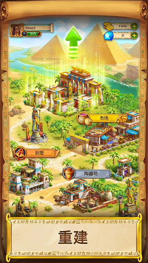 埃及的珠宝是一款三消建造类手游。进入游戏后,玩家要来到古老的埃及,为法老复兴整个文明,你将在尼罗河流域进行三消战斗,战胜一个又一个宫廷阴谋,让城市重新恢复元气。游戏采用超复古的画面以及融合了大量埃及的元素,让玩家心情舒畅。