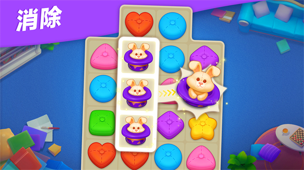 4、当消除多个相同的抱枕时,还可以获得强有力的道具,更好的完成关卡;