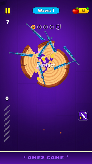 2、该游戏非常类似“见缝插针”,通过点击屏幕,将手中的刀丢出插在树桩之上。