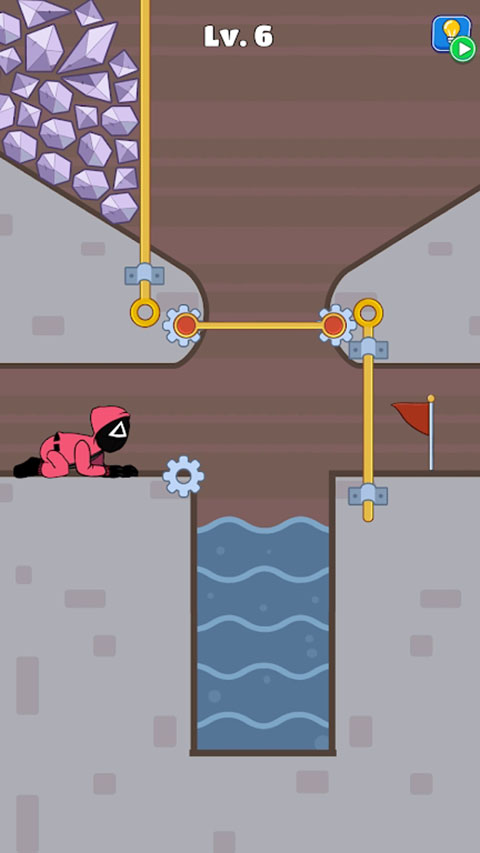 5、第六关,先将中间的横杆打开,再将上面的落石放下来堵住水池就可以通过了。