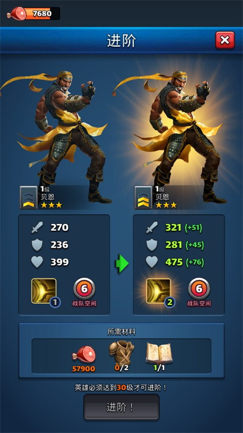 在当前等级升满的时候,可以选择升阶(ascend)来继续提升你的英雄,升阶需要用到不同的升阶材料以及食物,这些材料在平时的推图中偶尔获取