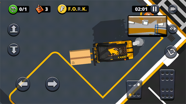 7、可以看到叉车上方有箭头标识,这是下一目标的方向,同是可以看懂地图上的“O”字母,我们每关都可以收集“FORK”这四个字母,想要三星通关,就必须需要收集了。