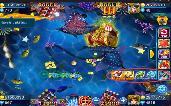 2、在冰冻加锁定之后命中这条特殊的鱼,炮台顿时进入变身状态,几百发炮弹只管对着大鱼开炮即可,在短短的几十秒时间内就可以获得大量的金币。